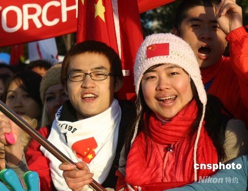 圖為中國留學(xué)生冒秋寒歡迎奧運(yùn)圣火在堪培拉傳遞。 作者: 沈晨