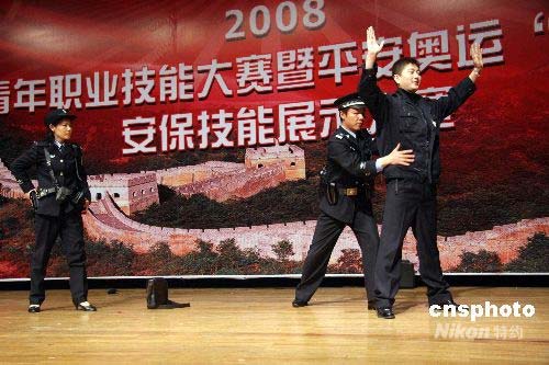 以“迎奧運(yùn)、比技能、促振興”為主題的2008沈陽青年職業(yè)大賽開幕式暨奧運(yùn)安保技能展示大賽4月24日在沈陽舉行。這次大賽充分展示沈陽市公安民警關(guān)注奧運(yùn)、參與奧運(yùn)、奉獻(xiàn)奧運(yùn)的精神風(fēng)貌,通過比賽將全面提升奧運(yùn)安保人員的綜合素質(zhì)、執(zhí)法能力和實(shí)戰(zhàn)能力,打造一支高效率、高水平、符合奧運(yùn)規(guī)則、體現(xiàn)國際水平的安保服務(wù)隊(duì)伍,確保沈陽賽區(qū)足球比賽順利進(jìn)行。中新社發(fā) 趙敬東 攝