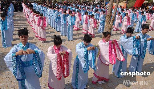 4月27日,福建閩侯縣首屆傳統(tǒng)漢服成年禮活動在福州曇石山博物館舉行,300名中學生身著傳統(tǒng)漢服出席。整個成年禮儀活動按傳統(tǒng)禮儀進行,分為加冠、加笄、成人宣誓、敬師長等環(huán)節(jié),是目前福建規(guī)模最大的傳統(tǒng)漢服成年禮活動。中新社發(fā) 劉可耕 攝