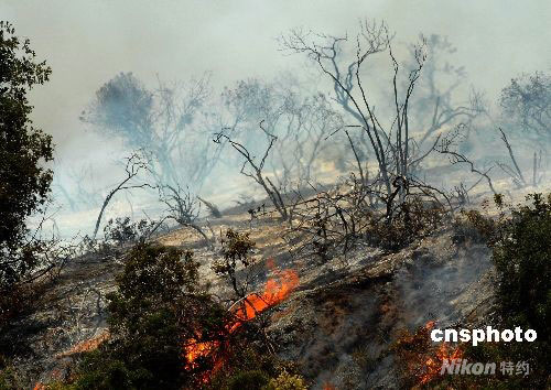 洛杉磯附近Sierra Madre的山林大火已經(jīng)燃燒了三天,過火面積近五百英畝。中新社發(fā) 張煒 攝