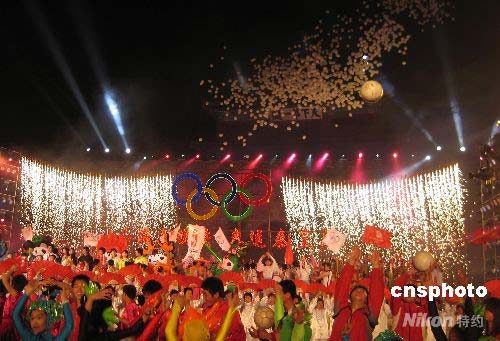 演員和觀眾振臂歡呼,臺(tái)上臺(tái)下焰火輝映,共同期待一百天后的北京奧運(yùn)盛會(huì)。 中新社發(fā) 潘海濤 攝