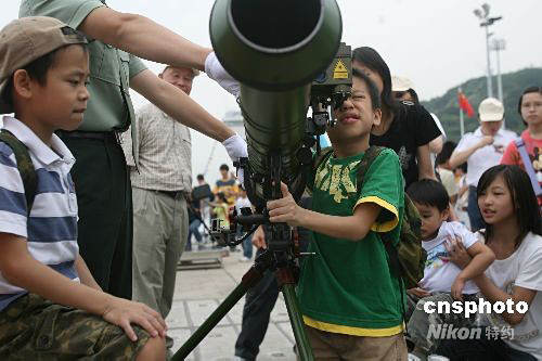 圖為市民在昂船洲軍營近距離觸摸輕武器。中新社發(fā) 武仲林 攝