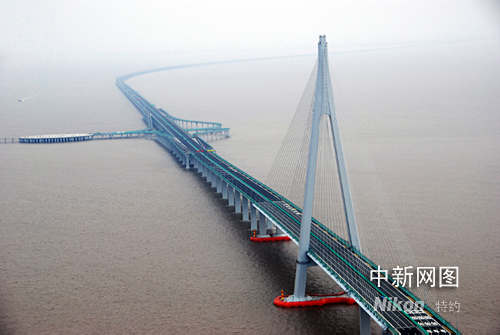 備受矚目的世界第一跨海大橋——杭州灣跨海大橋五月一日下午舉行了簡潔的通車儀式,正式進入試運營階段。圖為雄偉的杭州灣跨海大橋航拍美景。