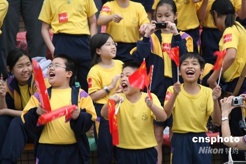 圖為在沙田馬場出席“萬眾歡騰迎圣火”大型社區(qū)慶;顒拥男∨笥褌。中新社發(fā) 武仲林 攝