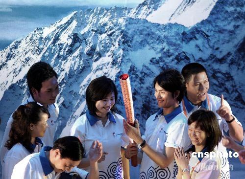 奧運(yùn)圣火傳遞火炬手演藝明星陳坤、聯(lián)想集團(tuán)副總裁李嵐等在珠穆朗瑪峰巨幅招貼畫前端詳祥云火炬。中新社發(fā) 廖攀 攝