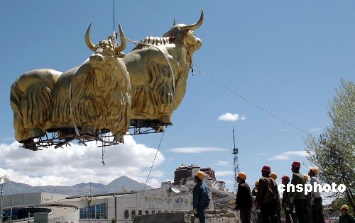 5月7日,位于拉薩市北京中路的被譽為拉薩古城市標的銅雕“牦!,因布達拉宮周邊環(huán)境整治的需要,搬離原處,落戶旁邊的休閑公園。這對重達數(shù)噸的銅牛,見證了西藏和諧穩(wěn)定和快速發(fā)展。中新社發(fā) 周波 攝