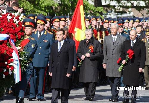 5月8日上午,俄羅斯新任總統(tǒng)梅德韋杰夫來到克里姆林宮西北側(cè)紅墻下的亞歷山大花園,向無名烈士墓敬獻(xiàn)花圈,紀(jì)念衛(wèi)國戰(zhàn)爭勝利63周年。俄前任總統(tǒng)普京、看守總理祖布科夫、議會(huì)兩院議長米羅諾夫和格雷茲洛夫等高官政要參加了儀式。這是梅德韋杰夫就任總統(tǒng)后的首場(chǎng)正式活動(dòng)。中新社發(fā) 田冰 攝