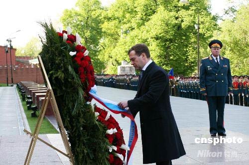 俄羅斯新任總統(tǒng)梅德韋杰夫來到克里姆林宮西北側紅墻下的亞歷山大花園,向無名烈士墓敬獻花圈,紀念衛(wèi)國戰(zhàn)爭勝利63周年。這是梅德韋杰夫就任總統(tǒng)后的首場正式活動。中新社發(fā) 田冰 攝