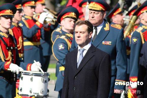 俄羅斯新任總統(tǒng)梅德韋杰夫來(lái)到克里姆林宮西北側(cè)紅墻下的亞歷山大花園,向無(wú)名烈士墓敬獻(xiàn)花圈,紀(jì)念衛(wèi)國(guó)戰(zhàn)爭(zhēng)勝利63周年。這是梅德韋杰夫就任總統(tǒng)后的首場(chǎng)正式活動(dòng)。中新社發(fā) 田冰 攝