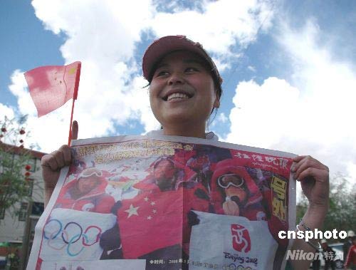 5月8日上午9時許,奧運圣火成功登上珠峰后,拉薩街頭一片歡騰,市民歡天喜地奔走相告。拉薩的平面主流媒體《拉薩晚報》,全面刊登了奧運圣火登珠峰的詳細(xì)消息,一些熱心市民自發(fā)走上街頭,發(fā)送報紙,引得市民爭相觀看。 中新社發(fā) 周波 攝