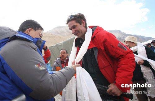5月9日,在親眼目睹了奧運(yùn)圣火在珠峰傳遞的盛舉后,6家受邀的境外媒體的記者離開珠峰大本營(yíng)絨布新聞中心,將奔赴北京。境外記者、北京奧組委的官員和工作人員、受邀的境內(nèi)記者和本次活動(dòng)的組織者道別,西藏自治區(qū)黨委宣傳部常務(wù)副部長(zhǎng)、珠峰新聞中心主任沈開運(yùn)前來送行。圖為工作人員向境外記者獻(xiàn)上了潔白的哈達(dá)。中新社發(fā) 盛佳鵬 攝