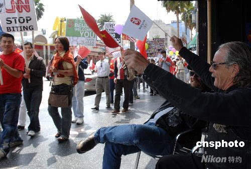 當(dāng)?shù)貢r(shí)間5月10日,通過網(wǎng)絡(luò)自發(fā)組織的南加州數(shù)百名華人華僑、留學(xué)生在洛杉磯著名的好萊塢星光大道上參加支持北京奧運(yùn)集會(huì)游行活動(dòng)。游行活動(dòng)在歡歌笑語(yǔ)中進(jìn)行,沿途受到一些洛杉磯市民的支持和響應(yīng)。 中新社發(fā) 張煒 攝