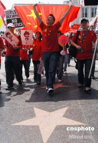 通過網(wǎng)絡(luò)自發(fā)組織的南加州數(shù)百名華人華僑、留學(xué)生在洛杉磯著名的好萊塢星光大道上舉行支持北京奧運(yùn)集會(huì)游行活動(dòng)。中新社發(fā) 張煒 攝