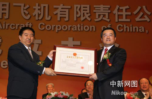國家工商行政管理總局相關(guān)負(fù)責(zé)人向中國商用飛機(jī)有限責(zé)任公司董事長張慶偉(右)頒發(fā)企業(yè)法人營業(yè)執(zhí)照。