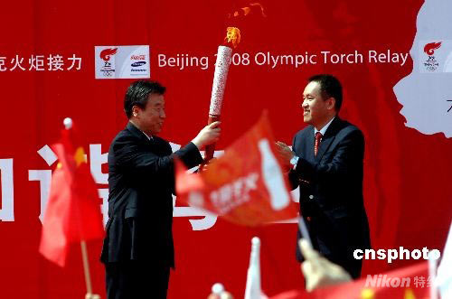 5月11日上午9點40分左右,北京奧運會火炬接力境內(nèi)福建福州站起跑儀式在福州五一廣場隆重舉行。圖為中共福建省委書記盧展工(左)從北京奧組委官員張矛手中接過火炬。