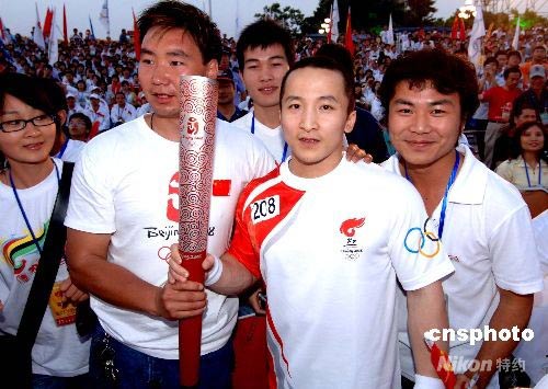在北京奧運(yùn)會(huì)火炬接力境內(nèi)傳遞福建福州站慶典儀式上,福州市民爭(zhēng)先與雅典奧運(yùn)會(huì)舉重冠軍、奧運(yùn)火炬手石智勇合影。 中新社發(fā) 劉可耕 攝