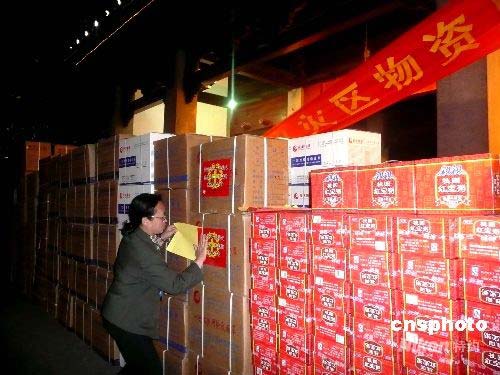 5月13日晚,揚(yáng)州市紅十字會(huì)工作人員將收到的救災(zāi)款、救災(zāi)帳篷、醫(yī)療器械、藥品和食品連夜送赴四川地震災(zāi)區(qū),以最快速度把這些救災(zāi)款、物轉(zhuǎn)交給災(zāi)區(qū)人民。圖為揚(yáng)州市紅十字會(huì)工作人員在救災(zāi)物資上貼“愛心”標(biāo)志。中新社發(fā) 崔佳明 攝