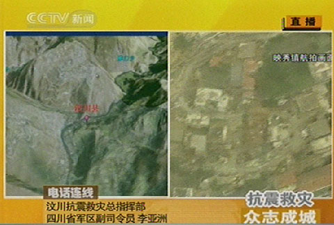 地震重災(zāi)區(qū)映秀鎮(zhèn)航拍畫面(電視截圖)