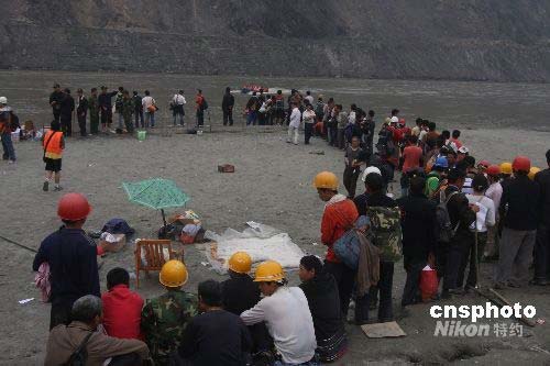 汶川縣映秀鎮(zhèn)等災(zāi)區(qū)群眾經(jīng)過幾天的跋涉,走到安全地帶等待運往災(zāi)民安置點。中新社發(fā) 郭國權(quán) 攝