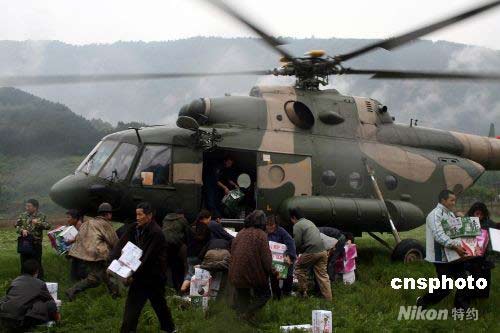 5月14日10時45分,成都軍區(qū)某陸航團四架直升機抵達(dá)四川大地震震中汶川縣。這是災(zāi)后第一次成功降落到汶川災(zāi)區(qū)的飛機,為受災(zāi)群眾送去了生活必需品。中新社發(fā) 張雷 黃龍 攝
