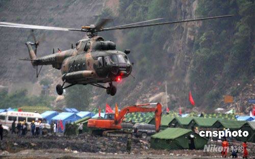 5月21日,運(yùn)滿傷員的軍用直升機(jī)降落在映秀臨時(shí)救助點(diǎn)。中新社發(fā) 曾憲平 攝