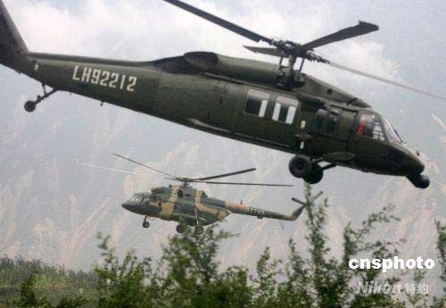 5月22日,陸航黑鷹和米-17直升機空降帳篷等救災(zāi)急需物資到受災(zāi)嚴重的高山羌寨。中新社發(fā) 賈國榮 攝