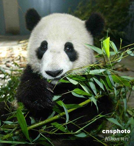 圖為大熊貓?jiān)谶M(jìn)食。 中新社發(fā) 富田 攝