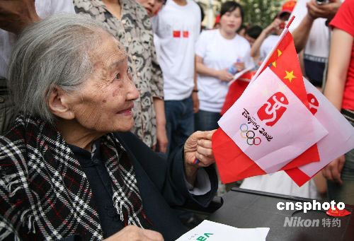 圖:百歲老人手持國旗為火炬?zhèn)鬟f加油