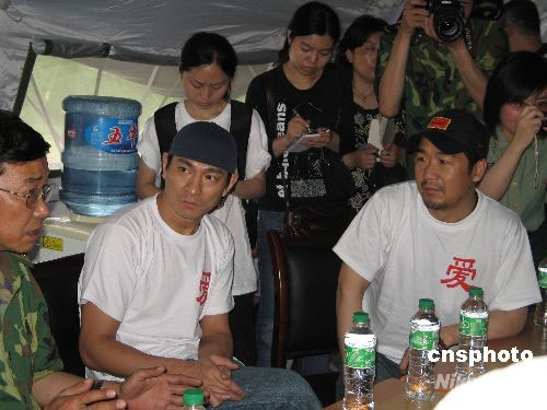 5月29日下午3時(shí)許,劉德華、張國立、鄭秀文、葛優(yōu)、馮小剛、陳道明等人來到收治了3000余名地震傷員的成都軍區(qū)總醫(yī)院進(jìn)行慰問。其間,劉德華、張國立、陳道明等人分別發(fā)言。一句句鼓勵(lì)的話語,一聲聲親切的問候,給傷員和醫(yī)護(hù)人員帶來了快樂和勇氣。據(jù)了解,這是“5.12關(guān)愛行動(dòng)”的第二站, 此次活動(dòng)由劉德華和張國立等人發(fā)起。中新社發(fā) 朱琥姚遠(yuǎn) 攝