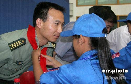 圖為小營(yíng)員為費(fèi)俊龍系上紅領(lǐng)巾。