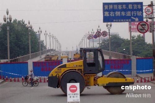 6月2日凌晨三時(shí),因小商品攤位發(fā)生火災(zāi)導(dǎo)致南京長江大橋南引橋第一橋孔嚴(yán)重受損,大橋?qū)嵭薪煌ü苤疲卉嚰靶⌒涂蛙嚳衫@行上橋外,其他車輛二十四小時(shí)禁止通行。受此影響,當(dāng)日南京碼頭輪渡運(yùn)送過江乘客達(dá)十萬人以上。圖為南京長江大橋南引橋設(shè)置的禁止交通圍檔。中新社發(fā) 王國安 攝