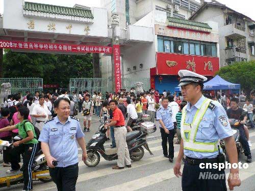 6月7日,全國高考第一天,桂林中學(xué)高考點(diǎn),交警現(xiàn)場維持秩序。2008年廣西高考報(bào)名人數(shù)30萬3778人,首次突破30萬人,比2007年增長3.20%。中新社發(fā) 周利朔 攝