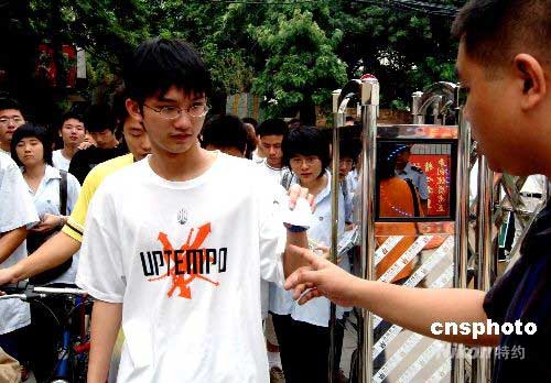 參加首日高考的福州考生步入福州銅盤(pán)中學(xué)考點(diǎn)時(shí),主動(dòng)出示準(zhǔn)考證和身份證。中新社發(fā) 劉可耕 攝