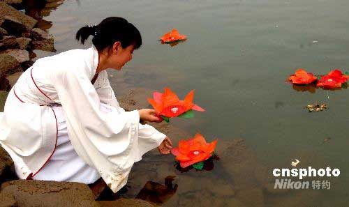 一名身著傳統(tǒng)漢服的福建青年女子向閩江放河燈,悼念在四川大地震中遇難的同胞。中新社發(fā) 劉可耕 攝
