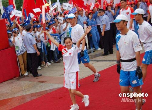 6月8日上午,北京奧運火炬在革命老區(qū)廣西百色平果縣進行傳遞,第一棒火炬手是平果縣希望小學(xué)校長、壯族姑娘周標亮,她曾受到鄧小平的資助。上世紀九十年代,鄧小平以“一個老共產(chǎn)黨員”的名義向希望工程捐款5000元,這筆捐款被落實到平果縣希望小學(xué),使25名瀕臨失學(xué)的貧困學(xué)生得以繼續(xù)學(xué)業(yè),周標亮就是當年得到資助的學(xué)生之一。后來,這位壯族姑娘考取了一所師范學(xué)校,畢業(yè)后她回到培養(yǎng)自己的平果縣希望小學(xué)任教,2005年被任命為該校校長。中新社發(fā) 劉萬強 攝