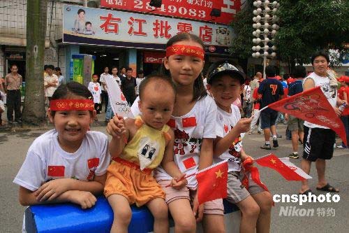 圖為一家姐弟四人手舉五星紅旗迎接奧運(yùn)圣火。 中新社發(fā) 周兆軍 攝
