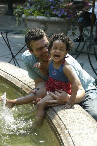圖為紐約曼哈頓中城的布萊恩公園,一對父女在噴水池邊戲水消夏。中新社發(fā) 魏晞 攝