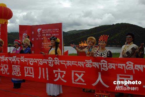 奧運(yùn)圣火在云南香格里拉傳遞,在結(jié)束儀式現(xiàn)場(chǎng),全場(chǎng)共同高歌《一個(gè)媽媽的女兒》,為四川災(zāi)區(qū)人民祝福。 中新社發(fā) 石雨 攝