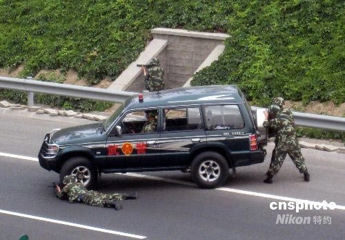 13日,中國(guó)“長(zhǎng)城5號(hào)”國(guó)家級(jí)反恐怖演習(xí)科目之一的處置劫持人質(zhì)事件,在人員入出境最頻繁的北京首都國(guó)際機(jī)場(chǎng)附近進(jìn)行。演習(xí)過程中,三輛運(yùn)動(dòng)員班車行至首都機(jī)場(chǎng)高速北線某橋面時(shí),被兩輛面包車阻停,“恐怖分子”將車上人員劫為人質(zhì)。中新社發(fā) 于立霄 攝
