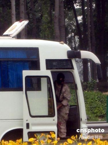 圖為演習(xí)過程中,“恐怖分子”在劫持的班車上望風(fēng)。 中新社發(fā) 未然 攝