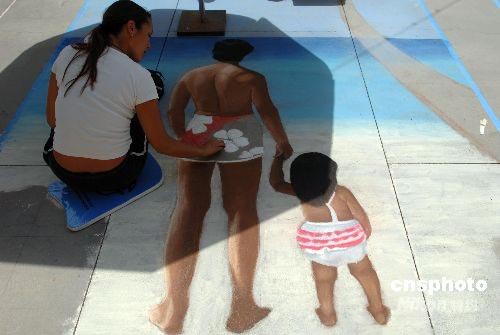 一名畫家正在創(chuàng)作粉筆畫《看!。中新社發(fā) 張煒 攝