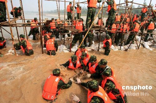 6月18日,山東省軍區(qū)和濟(jì)南警備區(qū)在濟(jì)南西郊玉清湖附近黃河大堤舉行大型防汛搶險(xiǎn)演練。來自濟(jì)南市的10支民兵預(yù)備役部隊(duì)、黃河專業(yè)搶險(xiǎn)隊(duì)等共1300余名隊(duì)員演練了水情偵察、封堵決口、爆破分洪、管涌搶護(hù)、堤壩搶護(hù)、緊急營救、搶筑子堤等七項(xiàng)防汛搶險(xiǎn)科目。中新社發(fā) 周青先 攝