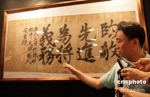 預(yù)展中,一幅紙質(zhì)黃舊的書法作品——“臨敵先進(jìn),為將義務(wù)”吸引眾人的眼球,這是當(dāng)年刺殺伊藤博文的韓國民族英雄安重根在獄中的絕筆書。圖為工作人員講解這幅書法作品的歷史價值。中新社發(fā) 趙雋 攝
