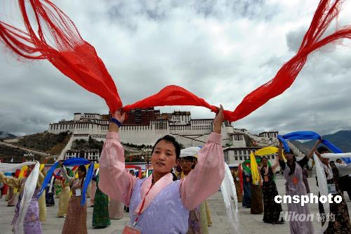 6月21日,奧運(yùn)火炬在西藏拉薩進(jìn)行傳遞。在布達(dá)拉宮廣場舉行的奧運(yùn)史上首次熔火儀式現(xiàn)場,能歌善舞的藏族少女揮舞哈達(dá)迎接奧運(yùn)火炬。中新社發(fā) 廖攀 攝