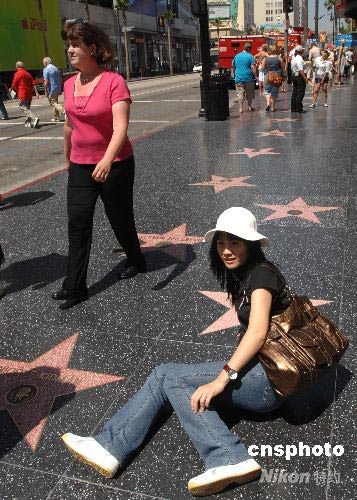 一名來(lái)自廣東的游客在好萊塢星光大道上拍照留念。中新社發(fā) 張煒 攝