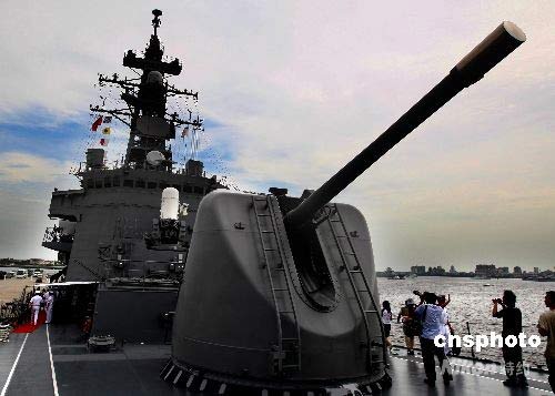 日本艦艇“漣”號(hào)到達(dá)湛江軍港后,中日記者應(yīng)邀到“漣”號(hào)上參觀采訪。中新社發(fā) 宋吉河 攝