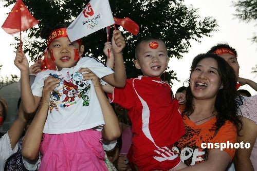 圖為街頭兒童歡迎奧運火炬?zhèn)鬟f。中新社發(fā) 張云 攝