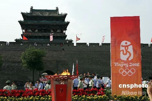 6月25日,奧運(yùn)火炬在山西平遙古城順利傳遞。整個(gè)傳遞過程中的唯一一次古城墻之旅,充分展現(xiàn)了平遙深邃的歷史特色。中新社發(fā) 張?jiān)?攝