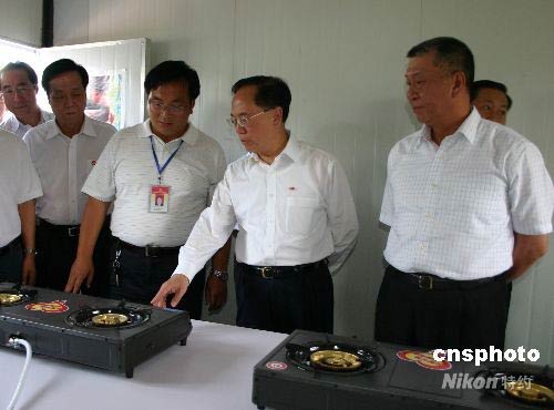 香港特首曾蔭權(quán)、澳門特首何厚鏵一行在四川省副省長魏宏陪同下,抵達(dá)地震重災(zāi)區(qū)彭州市小漁洞鎮(zhèn)大楠社區(qū)安置點,慰問當(dāng)?shù)厥転?zāi)群眾,參觀安置房、公共廚房和安置點內(nèi)的娛樂設(shè)施,并體驗了公共廁所。中新社發(fā) 霍潺 攝