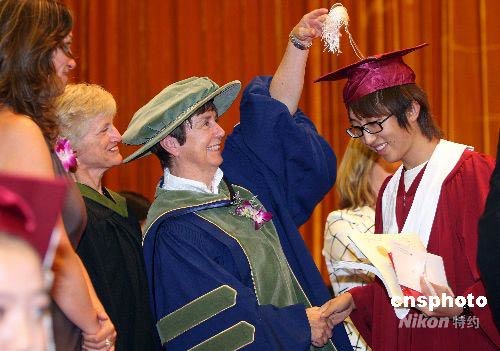 六月二十八日,北京中加學(xué)校2008年高中及IHM專(zhuān)業(yè)學(xué)生畢業(yè)典禮在北京人民大會(huì)堂舉行,321名學(xué)生經(jīng)過(guò)在該校三年的學(xué)習(xí),獲得中國(guó)和加拿大兩國(guó)高中畢業(yè)證書(shū),其中有314名學(xué)生申請(qǐng)了加拿大的大學(xué),并被加拿大及歐美、澳大利亞共68所大學(xué)錄取,錄取率為100%。圖為加拿大教育官員為畢業(yè)學(xué)生撥帽繩。中新社發(fā) 毛建軍 攝